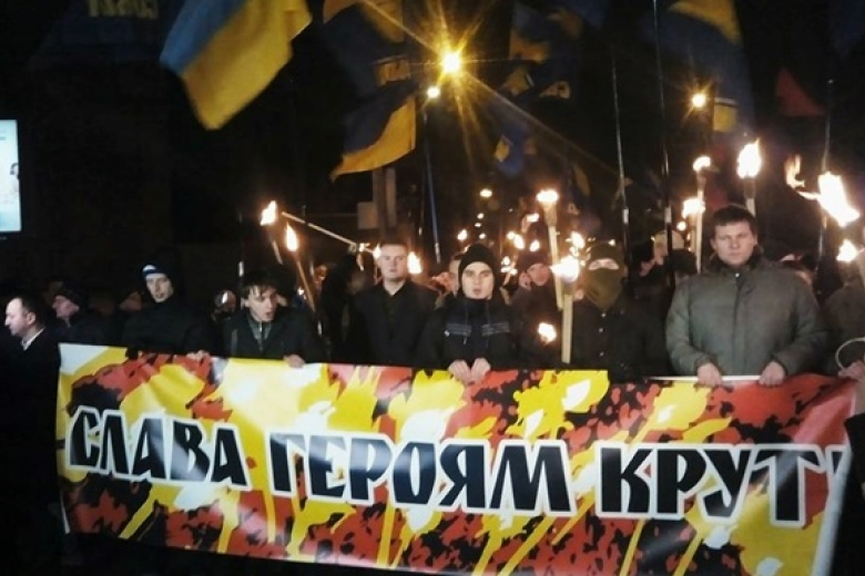 Представитель партии "Свобода" и общественной организации "Сокол" провели в пятницу вечером в Киеве факельное шествие в честь Героев Крут.