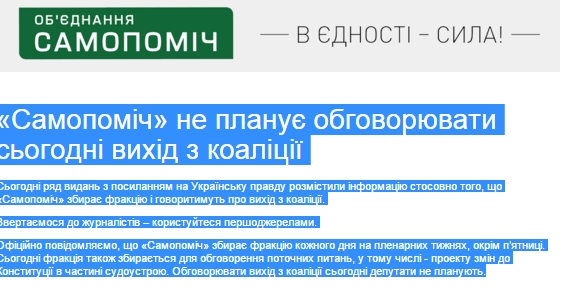 Примечательно, что спустя полдня после того, как данное заявление было обнародовано в СМИ, у Садового заявили, что сегодня обсуждать вопрос выхода из коалиции не намерены. Фракция якобы ежедневно собирается для обсуждений разного рода вопросов, но выходить из состава парламентского большинства не планирует.