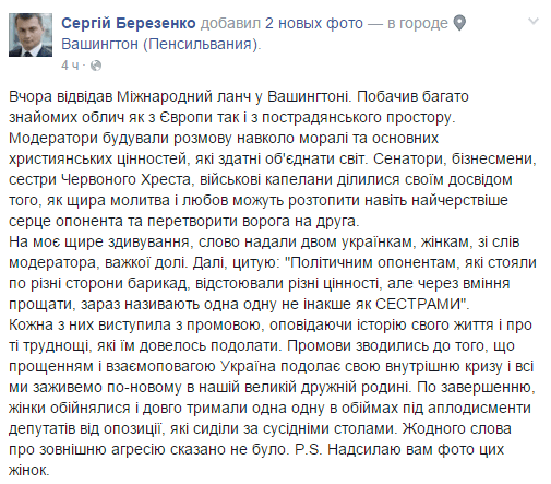 "Вчера (3 февраля) посетил Международный ланч в Вашингтоне. Увидел много знакомых лиц как из Европы, так и с постсоветского пространства. Модераторы строили разговор вокруг морали и основных христианских ценностей, которые способны объединить мир ... На мое искреннее удивление, слово предоставили двум украинкам, женщинам, по словам модератора, сложной судьбы. Далее цитирую: "Политическим оппонентам, которые стояли по разные стороны баррикад, отстаивали разные ценности, но через умение прощать, сейчас называют друг друга не иначе как сестра", - написал Березенко.