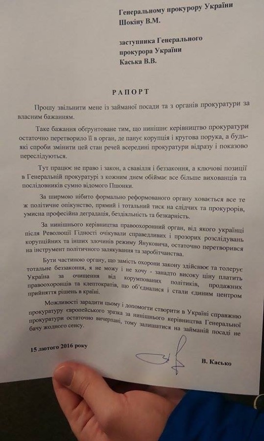 "Рапорт. Прошу уволить меня из органов прокуратуры по собственному желанию. Такое желание обосновано тем, что руководство прокуратуры окончательно превратило ее в орган, где царит коррупция и круговая порука. Здесь работает произвол и беззаконие. Ключевые позиции в ГПУ с каждым днем занимает все больше воспитанников и последователей Пшонки. За ширмой формально реформированного органа скрывается политическое опекунство и прямое давление на следователей и прокуроров", - зачитал журналистам часть документа Виталий Касько.