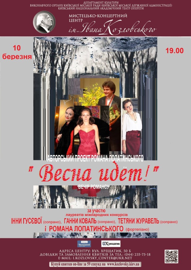 10 марта киевлян ждет творческий сюрприз от прославленного пианиста – в Художественно-концертном центре им. Ивана Козловского (филиал Национальной оперетты Украины, ул. Крещатик, 50-б) Роман Лопатинский представит свой авторский проект, посвященный женщинам. Названием проекта стала цитата из известного романса Сергей Рахманинова «Весна идет!».