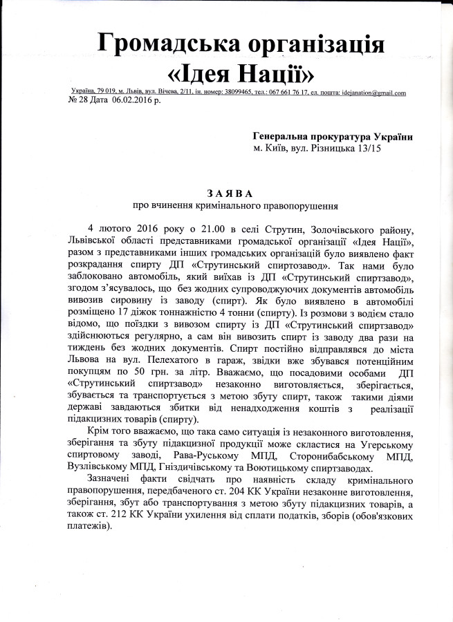 Как сообщил председатель ГО «Идея нации» Остап Стахив, 4 февраля 2016 в с. Струтин Золочевского района Львовской области местные активисты стали свидетелями хищения спирта, которое, как выяснилось, происходило на предприятии системно в течение длительного времени (видео)