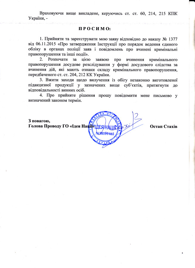 Активисты заблокировали автомобиль, вывозивший с ГП «Струтинский спиртзавод» 17 бочек спирта общим весом почти 4 тонны без сопроводительных документов. Проезжавшие через Струтин члены «Идеи Нации» вмешались в происходящее, организовали общественный контроль с целью соблюдения законности при выявлении хищения. В результате автомобиль с «незаконным спиртом» был описан работниками полиции с участием понятых, опломбирован и оставлен на территории Золочевского районного управления полиции. По факту вывоза почти 4 тонн спирта с ГП «Струтинский спиртзавод» открыто уголовное производство по ч. 3 ст.191 УК Украины (присвоение/растрата имущества или завладение им путем злоупотребления служебным положением).