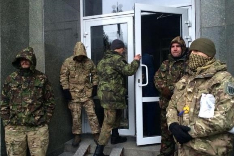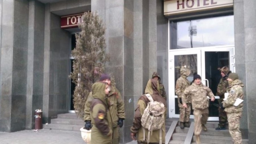 Накануне, одетые в камуфляж люди, которые называют себя членами организации "Радикальные правые силы", закрылись в актовом зале отеля Казацкий на Майдане.