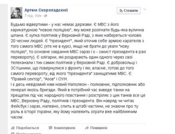 "Будем откровенны - у нас нет государства. Есть МВД с его карикатурной "новой полицией", которую может разогнать любая уличная шпана. Есть кучка политиков в Верховной Раде, из которых наберется человек 20 честных людей. Есть "президент", который окружил себя армией карателей из того же МВД (кто не в курсе, если не считать "новую полицию", то основная задача МВД сейчас и является - защита президента в случае переворота). Есть олигархи, которые раздирают друг друга через свои телеканалы и тех же политиков в Верховной Раде", - пишет Скоропадский.