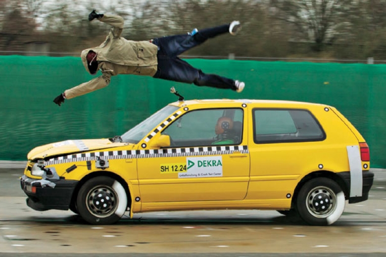 Хоть в автомобиле высокую защиту ног пешехода - есть большой риск получить травму серьезную травму головы о лобовое стекло или переднюю стойку.
