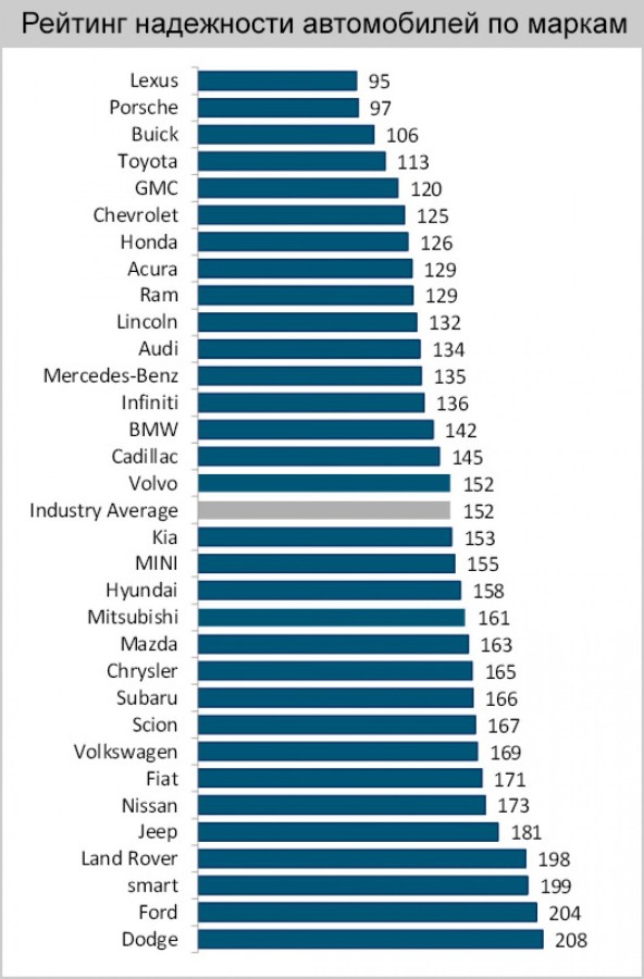 Степень надежности транспортного средства определяли количеством неисправностей на 100 автомобилей марки. Внимание, итоги: