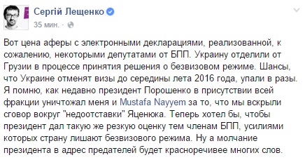 "Вот цена аферы с электронными декларациями, реализованной, к сожалению, некоторыми депутатами от БПП. Украину отделили от Грузии в процессе принятия решения о безвизовом режиме. Шансы, что Украине отменят визы до середины лета 2016 года, упали в разы", - пишет Лещенко на своей страничке в Facebook.