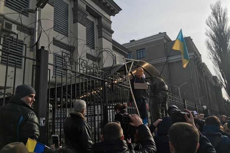Ранее с Майдана под посольство России пришла многотысячная колонна активистов. Транспортное движение по Воздухофлотскому проспекту перекрыто.