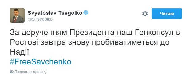Кроме того пресс-секретарь Порошенко Святослав Цеголко написал, что "по поручению президента наш генконсул в Ростове завтра снова будет пробиваться к Надежде Савченко".