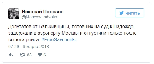 "Депутатов от Батькивщины, летевших на суд к Надежде, задержали в аэропорту Москвы и отпустили только после вылета рейса", - отметил он.