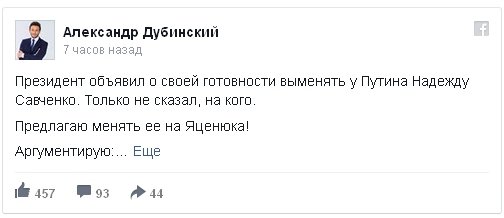 "Президент объявил о своей готовности выменять у Путина Надежду Савченко. Только не сказал, на кого. Предлагаю менять ее на Яценюка!" - написал журналист.