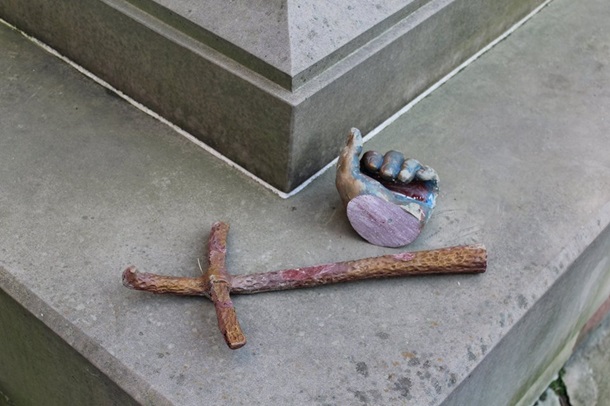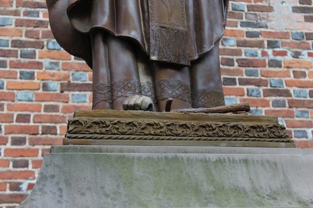 Сообщается, что у памятника, который стоит перед входом в костел святого Бартоломея, отпилили руку с крестом, которую в последствии бросили неподалеку.
