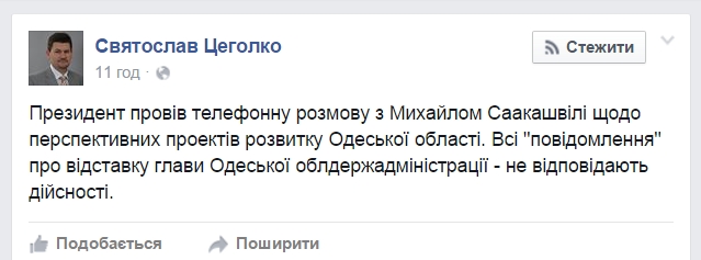 Как сообщил на своей странице в Facebook пресс-секретарь Петра Порошенко Святослав Цеголко, президент Украины не намерен увольнять губернатора Одесской области Михаила Саакашвили.