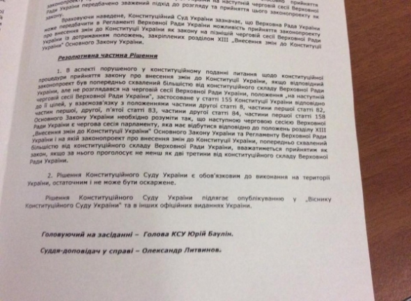Суд решил, что "Верховная Рада Украины может предусмотреть в регламенте Верховной Рады возможность принятия законопроекта о внесении изменений в Конституцию Украины в качестве закона на более поздний очередной сессии Верховной Рады с соблюдением положений, закрепленных разделом 13 "Внесение изменений в Конституцию Украины" Основного закона Украины".