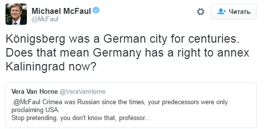 "Кенигсберг был немецким городом на протяжении многих веков. Значит ли это, что Германия имеет право присоединить Калининград сейчас?" – спросил Макфол.