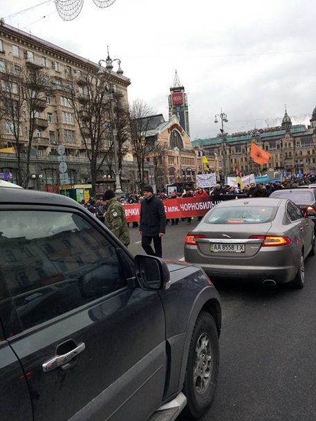 Как сообщают в Twitter, колона митингующих направляется под Кабмин с требованием отменить постановление правительства Азарова, урезающее выплаты чернобыльцам вдвое.