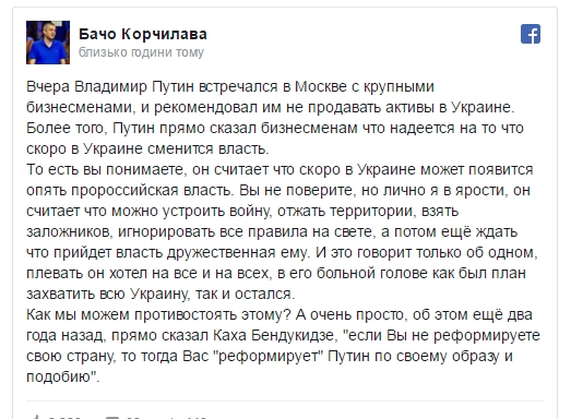 То есть вы понимаете, он считает что скоро в Украине может появится опять пророссийская власть. Вы не поверите, но лично я в ярости, он считает что можно устроить войну, отжать территории, взять заложников, игнорировать все правила на свете, а потом ещё ждать что прийдет власть дружественная ему. И это говорит только об одном, плевать он хотел на все и на всех, в его больной голове как был план захватить всю Украину, так и остался", - пишет в Соцсети Корчилава.
