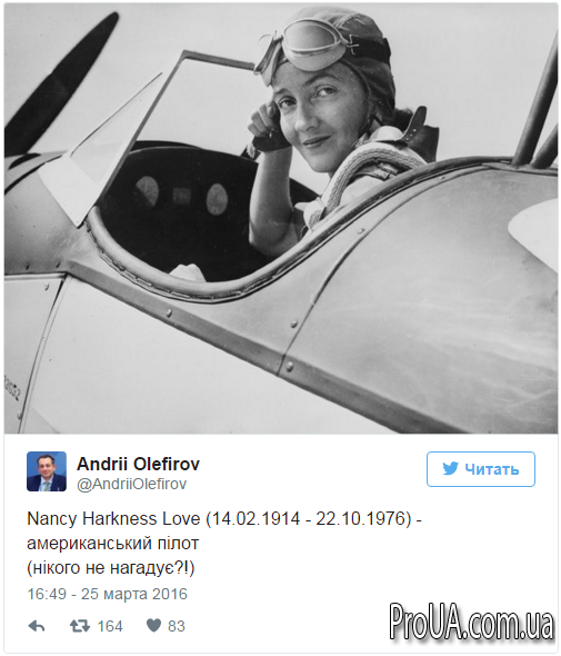Снимок Нэнси он опубликовал в своем Twitter. «Nancy Harkness Love (14.02.1914 — 22.10.1976) — американский пилот (никого не напоминает?!)» — написал украинский дипломат