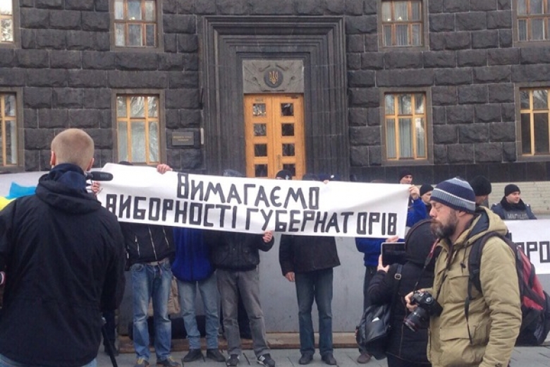 Протестующие держали в руках плакаты: "Порошенко в отставку!", "Требуем выборности губернаторов!", "Порошенко ГЕТЬ!", "Вон президента диктатора!", "Порошенко тиран!".