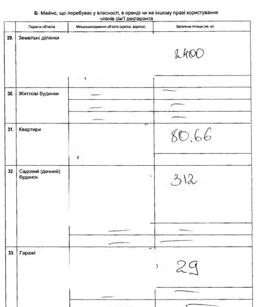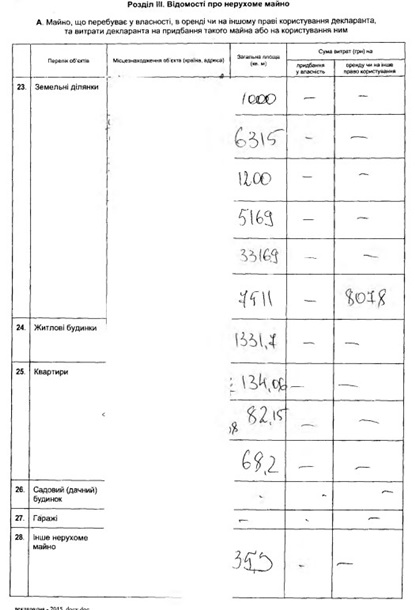Как указано в буманаг, Порошенко владеет или арендует: 6 земельных участков площадью 1 000 кв. м, 1 200 кв. м, 5 169 кв. м, 6 315 кв. м, 7 511 кв. м (на его аренду или другое право собственности уплачено 8 078 гривен), 33 169 кв. м; 3 квартиры площадью 68,2 кв. м, 82,15 кв. м и 134,06 кв. м; жилой дом площадью в 1 331,7 кв. м; другое недвижимое имущество площадью 35,3 кв. м.