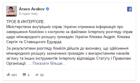 "После длительной процедуры проверки в файловой апелляционной комиссии Интерпола в Лионе - дожали - наша позиция признана правильной по отношению к апеллирующим - и по иску Украины все трое в международном розыске по всему миру", - написал он.