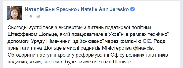 Как сообщила на своем Facebook министр финансов Наталия Яресько, в рамках технической помощи правительства Германии Шольце будет новым советником для Министерства финансов.
