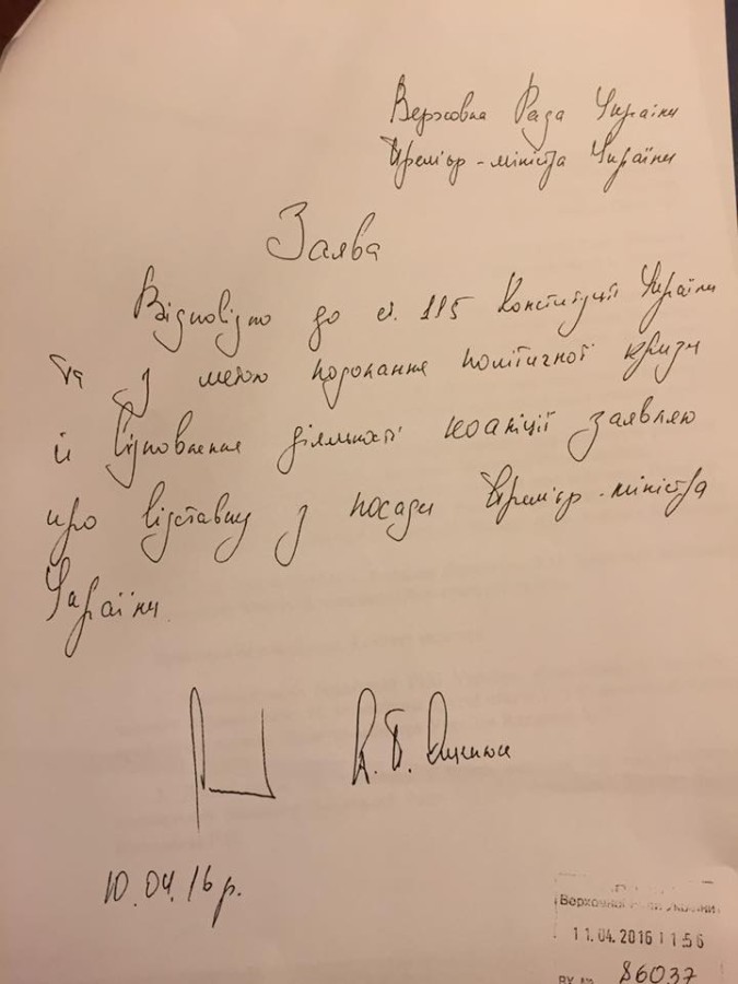 В Сеть попало заявление премьера Арсения Яценюка об отставке. Фото опубликовал на своей странице в Facebook нардеп Леонид Емец.