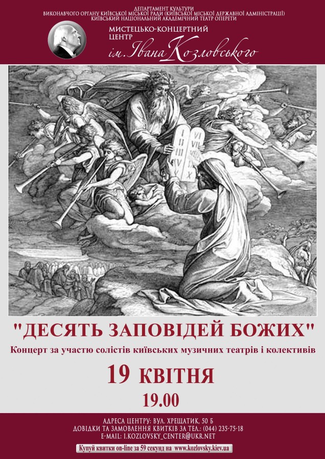 Одному из величайших христианских праздников - Пасхе - посвящается 19 апреля концерт "Десять заповедей Божиих", который традиционно пройдет в Художественно-концертном центре им. И.Козловского (филиал Национальной оперетты Украины). Вокальные, хоровые и даже хореографические номера еще раз напомнят зрителям о законах Божьих, соблюдая которые человек остается Человеком.