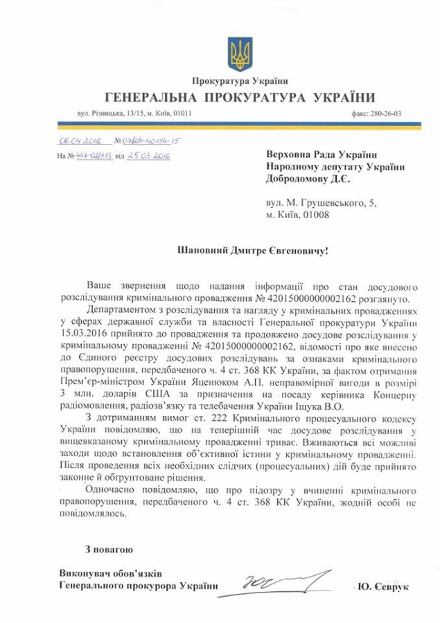 Так, в ответе на запрос нефракционного народного депутата, члена комитета Верховной Рады Украины по вопросам предотвращения и противодействия коррупции Дмитрия Добродомова, копию которого обнародовало на своем сайте общественное движение "Народный контроль", ГПУ сообщила, что департамент по расследованию и надзору в уголовных производствах в сфере госслужбы и собственности Генпрокуратуры продолжил досудебное расследование в уголовном производстве, предусмотренном ч.4 ст.368 Уголовного кодекса Украины по факту получения премьер-министром Яценюком неправомерной выгоды в размене $3 млн. за назначение на должность руководителя Концентра радиовещания, радиосвязи и телевидения Украины В.Ищука.