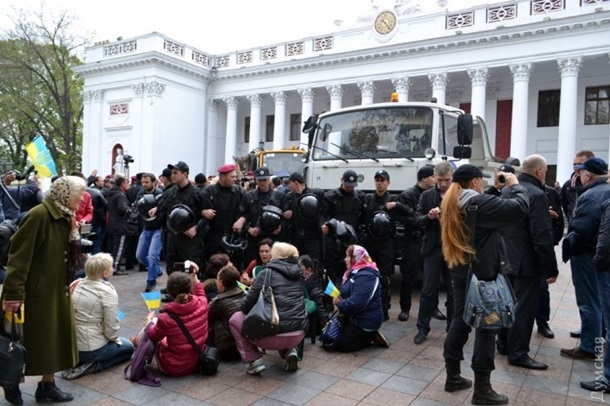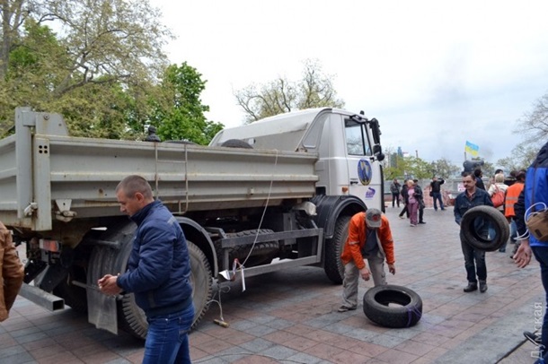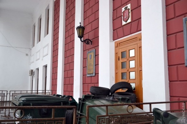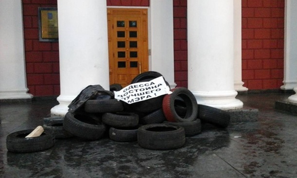 Сегодня протестующие в Одессе заблокировали шинами все три входа в здание мэрии. Таким образом активисты отреагировали на ночной разгром палаточного городка.