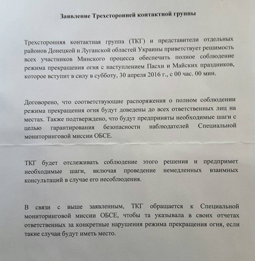 В ходе переговоров участников Трехсторонней контактной группы по урегулированию ситуации на Донбассе удалось достигнуть согласия о прекращении огня на период Пасхи и майских праздников, заявил действующий при ней представитель ОБСЕ Мартин Сайдик. "Хочу с удовлетворением отметить тот факт, что контактная группа на сегодняшнем заседании договорилась о следующем заявлении: "...Трехсторонняя контактная группа и представители отдельных районов Донецкой и Луганской областей Украины приветствуют решимость всех участников Минского процесса обеспечить полное соблюдение режима прекращения огня с наступлением Пасхи и майских праздников, которое вступит в силу в субботу, 30 апреля, с полуночи", - рассказал Мартин Сайдик.