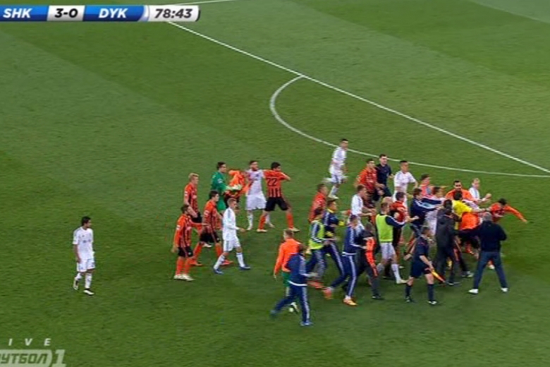 Скандалом завершился центральный матч 24-го тура чемпионата Украины между "Шахтёром" и "Динамо" (3:0). При счёте 3:0 у футболистов киевской команды сдали нервы и они устроили потасовку, которая превратилась в полноценную драку. Что тут и говорить, если даже Андрей Ярмоленко набросился на Тараса Степаненко с кулаками! Правда, началось всё с Сергея Рыбалки, который также начал предъявлять непонятные претензии в адрес игроков донецкой команды. В итоге Андрей Ярмоленко вместе с Тарасом Степаненко, Александром Кучером (который выбежал на поле защищать своих партнёров) и Мирчей Луческу был удалён.