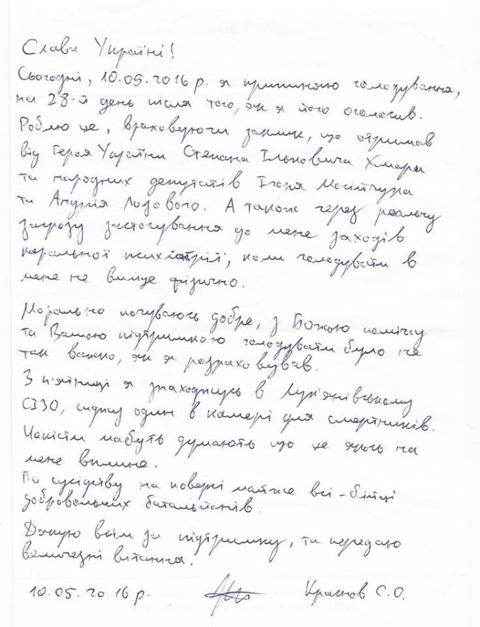 "Я прекращаю голодовку, на 28-й день, после того, как я ее объявил. Делаю это, учитывая призыв, который получил от Героя Украины Степана Ильковича Хмары и народных депутатов Игоря Мосийчука и Андрея Лозового", – говорится в письме.