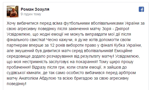 "Хочу извиниться перед всеми футбольными болельщиками Украины за свое агрессивное поведение по окончании матча "Заря" – "Днепр"! Осознаю, что никакие эмоции не могут оправдать мои действия после финального свистка. Осознаю, что моя несдержанность заслуживает наказания! Поэтому искренне прошу прощения. Сразу после игры, когда спали эмоции, я зашел в судейскую комнату, где лично извинился перед арбитром матча Анатолием Абдулой и всей бригадой за свое агрессивное поведение", – написал Роман в своем Facebook.