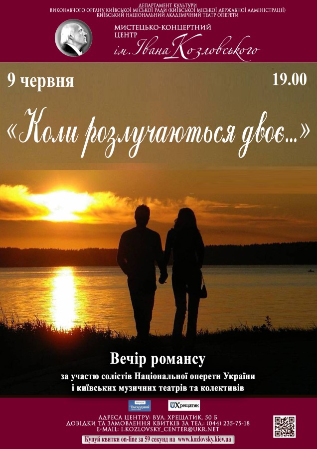 9 июня в 19 часов в Центре им. Ивана Козловского (Крещатик, 50-б, филиал Национальной оперетты Украины) Вас ждет Вечер романса, названием которого стала строка текста одного из самых популярных дуэтов «Когда расстаются двое ...» («Коли розлучаються двоє»).
