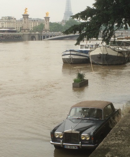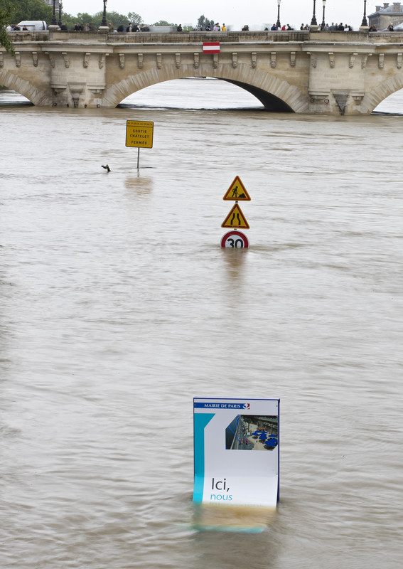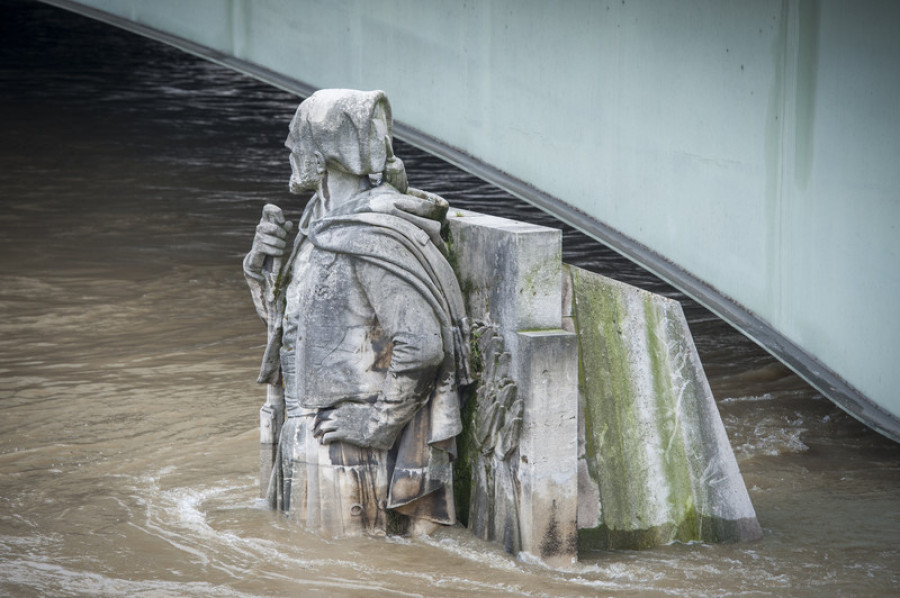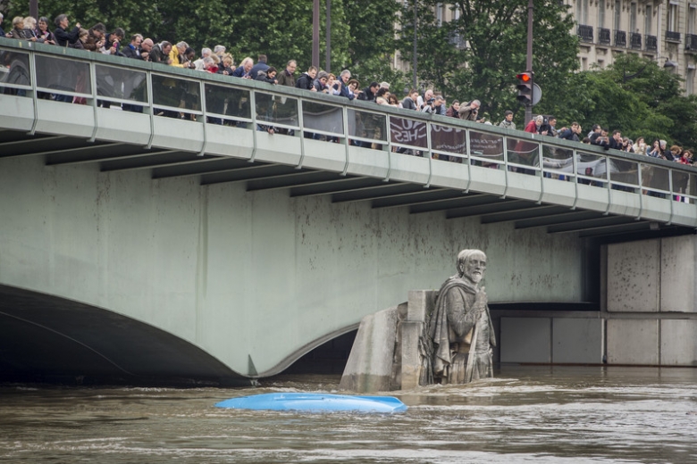 Уровень воды в Сене к полудню превысил отметку в 6 метров. Статуя Гуава у моста Альма служит для местных жителей мерилом уровня воды в реке.