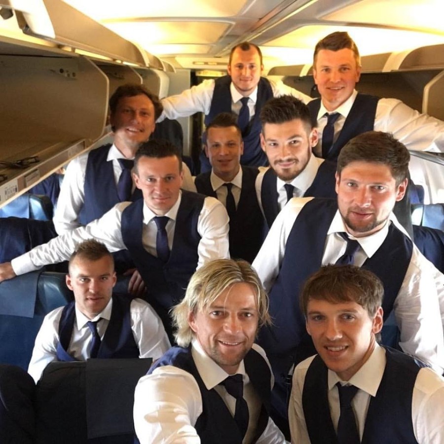 Футболисты вышли из самолета при полном параде: в цивильных костюмах и в галстуках.