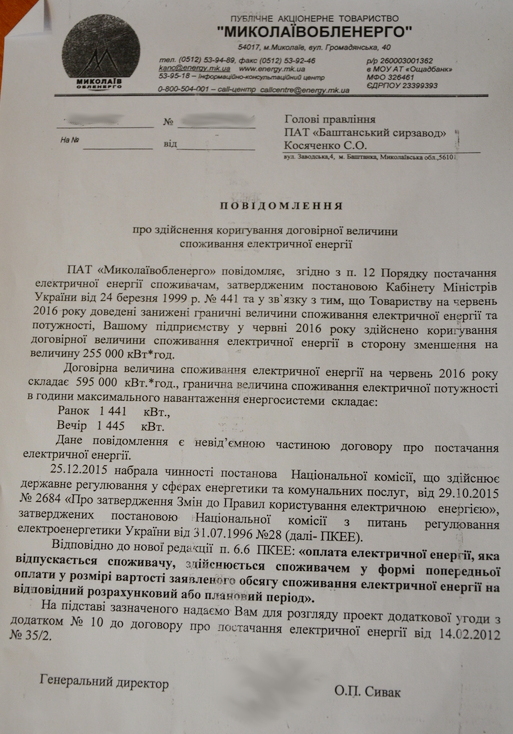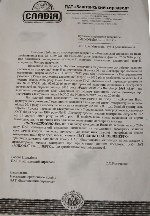 Подобные письма уже получили крупнейшие предприятия области: ГП «Зоря»-«Машпроект», ООО СП «Нибулон», ООО «Сандора», ПАО «Баштанский сырзавод» (ТМ «Славия»), ЧАО «Лакталис-Украина» и другие. Все это предприятие с миллиардными оборотами и электроэнергии они в год потребляют на десятки и сотни миллионов.