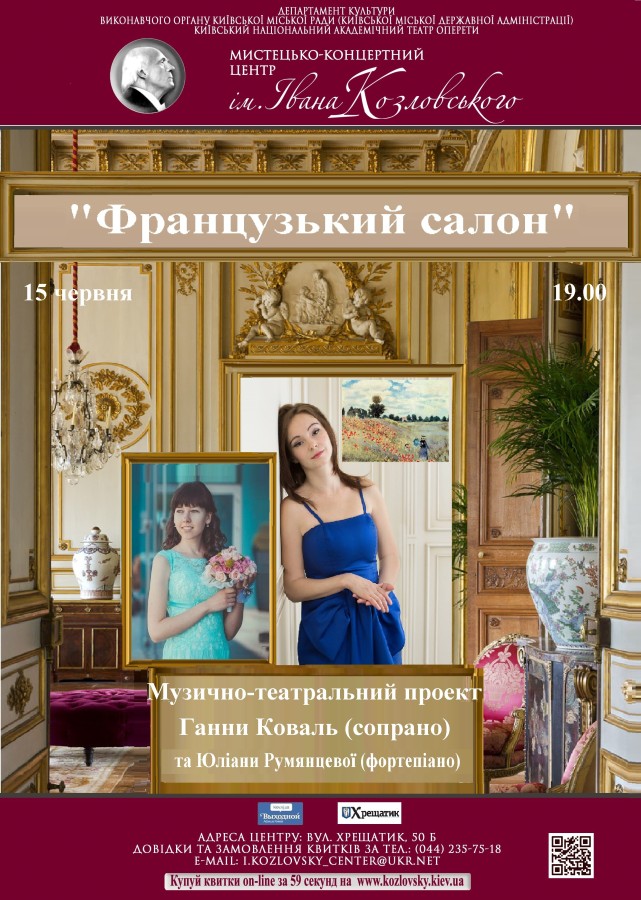 15 июня в 19 часов в Центре им. Ивана Козловского (Крещатик, 50-б, филиал Национальной оперетты Украины) состоится музыкальный вечер «Французский салон». В новом музыкально-театральном проекте лауреатов международных конкурсов - солистки Национальной оперетты Украины Анны Коваль (сопрано) и Юлианы Румянцевой (фортепиано) также принимает участие тенор Сергей Андрощук.