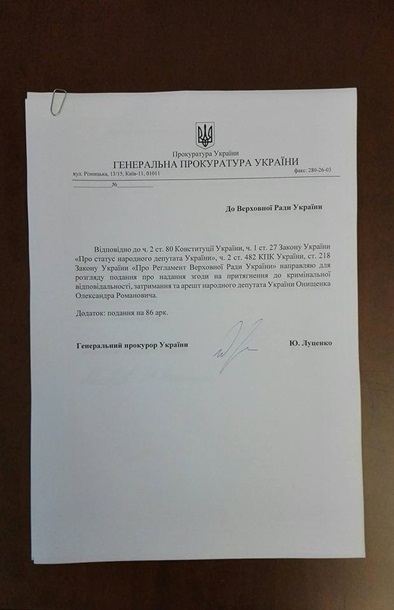 Генпрокурор Украины Юрий Луценко подписал представление в Верховную Раду об аресте народного депутата от группы "Воля народа" Александра Онищенко. Соответствующий документ Луценко обнародовал на своей странице в Facebook утром в четверг, 16 июня.