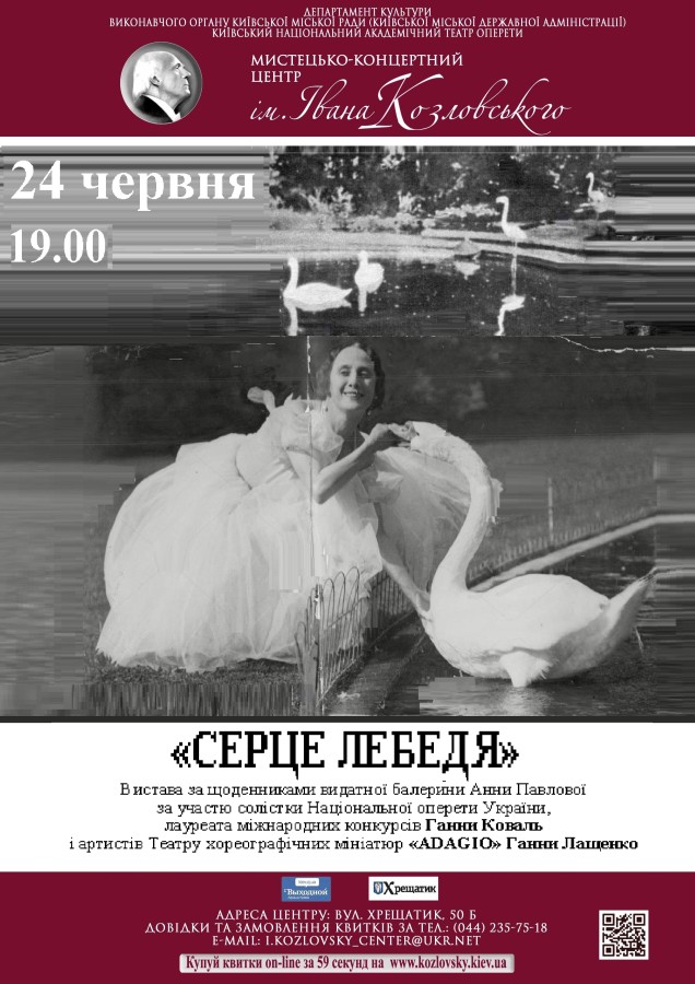 24 июня в 19.00 в Центре имени Ивана Козловского ( Крещатик, 50-б, филиал Национальной оперетты Украины) состоится премьера спектакля «Сердце лебедя», созданного по дневникам выдающейся балерины Анны Павловой.