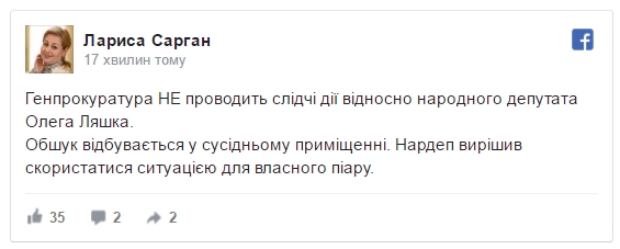 "Генпрокуратура не проводит следственные действия в отношении народного депутата Олега Ляшко. Обыск проходит в соседнем помещении. Нардеп решил воспользоваться ситуацией для собственного пиара", - пишет Сарган.