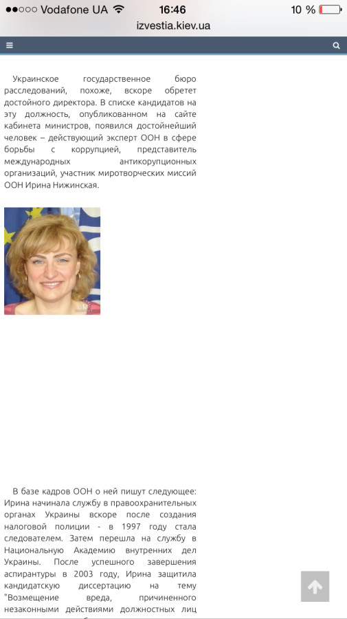 Украинское государственное бюро расследований, похоже, вскоре обретет достойного директора. В списке кандидатов на эту должность, опубликованном на сайте кабинета министров, появился достойнейший человек – действующий эксперт ООН в сфере борьбы с коррупцией, представитель международных антикорупционных организаций, участник миротворческих миссий ООН Ирина Нижинская.