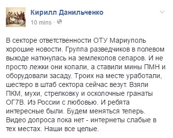 «В секторе ответственности ОТУ Мариуполь хорошие новости. Группа разведчиков в полевом выходе наткнулась на землекопов сепаров. И не просто лежки они копали, а ставили мины ПМН и оборудовали засаду», — пишет он.