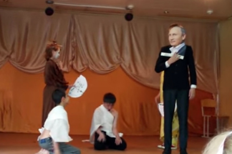 "А кто вам их отдаст-то", — с этими словами на сцене появляется мальчик в маске президента РФ Владимира Путина.