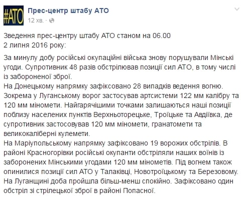 На донецком направлении зафиксировано 28 случаев ведения огня. В частности, в Луганском боевики применили артсистемы 122 мм калибра и 120 мм минометы. Самыми горячими точками остаются позиции сил АТО вблизи населенных пунктов Верхнеторецкое, Троицкое и Авдеевка, где террористы применяли 120-мм минометы, гранатометы и крупнокалиберные пулеметы.