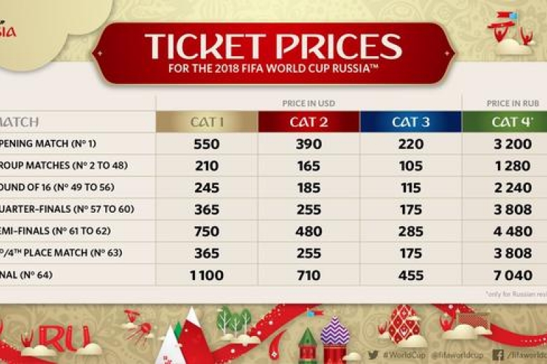 Традиционно билеты будут продаваться в трех ценовых категориях. А для россиян создана специальная четвертая. Если минимальная стоимость тикетов на групповой этап ЧМ-2018 составит 105 долларов (2 625 грн), то жители РФ смогут купить билеты на аналогичные места за1280 рублей (20 долларов).
