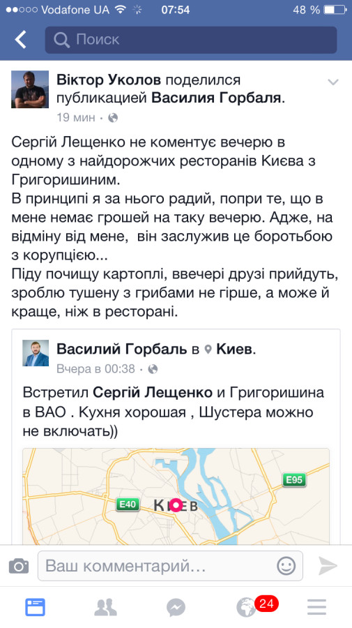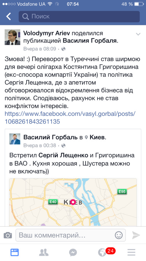 Народного депутата от БПП Сергея Лещенко заметили в Киеве в элитном ресторане "ВАО" вместе с российским бизнесменом Константином Григоришиным, который не так давно получил украинское гражданство.