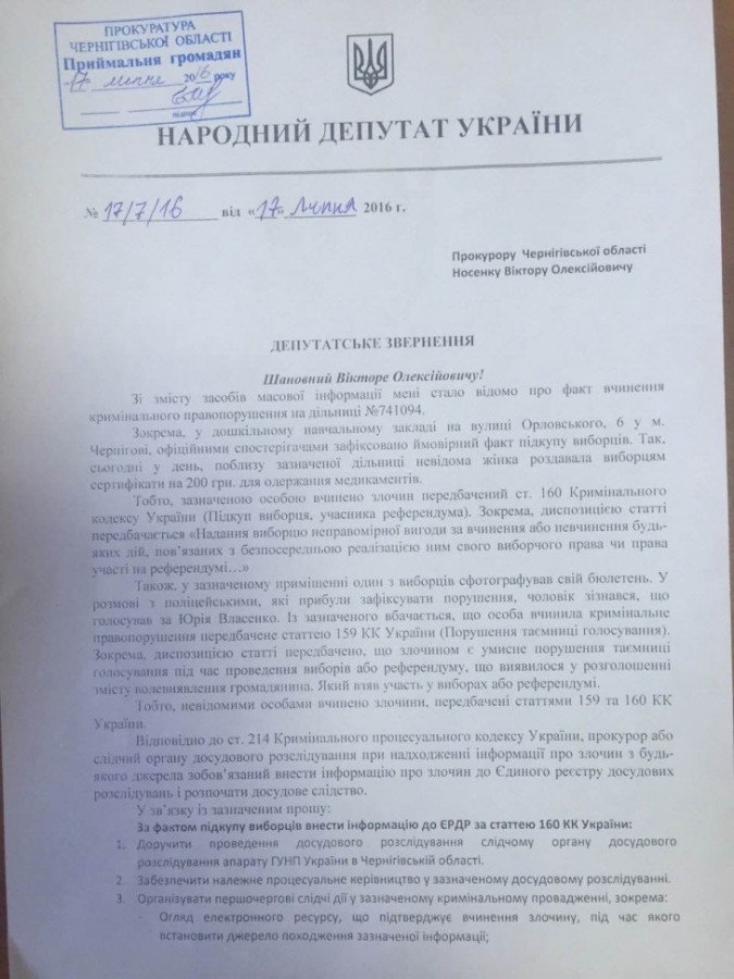 Щойно за моїм зверненням зареєстровано кримінальне провадження 42016270000000247 за зафіксованими фактами підкупу виборців кандидата від Батьківщини Юрія Власенко, якого кришує і покриває Альохін.